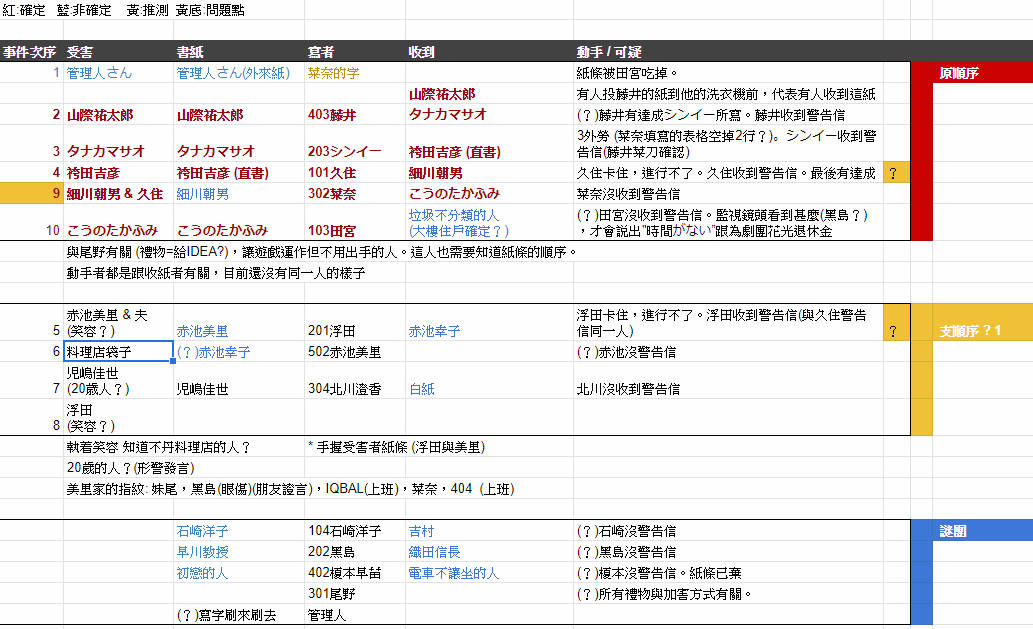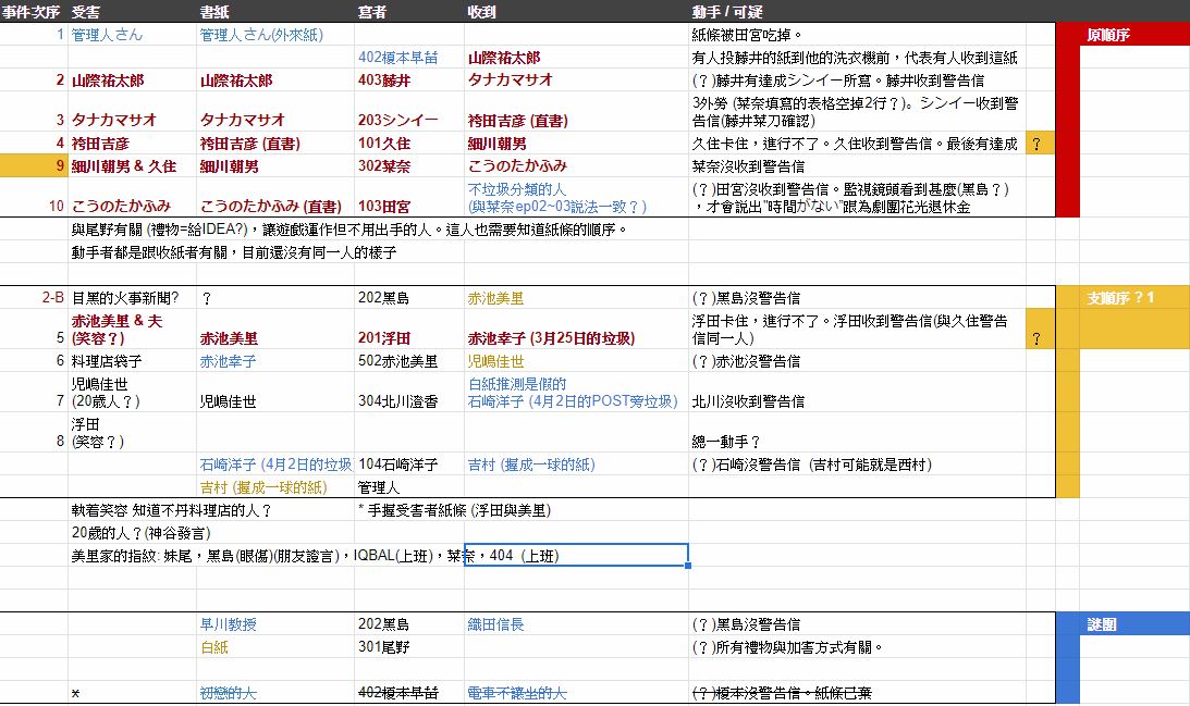 以主局順序寫法,跟菜奈的推測紙極之接近,但她只有浮田的部份特別分2行空才填寫,像知道是發生計劃以外的事? 如果照目前這規則下,第8話噴血的こうのたかふみ不會是寫者的田宮動手,而是菜奈或翔太或他們直接的相關者。死因也會是尾野所安排的禮物那樣。(是動手者參考IDEA?還是尾野已知道動手方式?) 在美里事件發生後,尾野也跟木下有站一起交流的樣子,而且木下的眼神整個是不安。 尾野也有種意外感,像遊戲局混入例外的事。她禮物沒表達過這事,還抓着翔太問。 推測尾野是遊戲主局的指引設計者。 菜奈刻意把遊戲跟美里事件連結起來也是問題,像遊戲分支導向的人,就真的像尾野所説。 發見者4人只有菜奈説巧克力的事。其他3人沒看過巧克力? 2) 美里事件所產生的分支,非主局遊戲。在表格用黃色分類。 久住跟浮田的警告信有同字跡,代表某些原因要讓遊戲由久住轉為浮田? 選定由浮田新出發是奇怪的點,浮田只有跟黑島,榎本,菜奈説過幸子的事。 ”あなたの番です”通常是由上一輪事件完工後寫的。 シンイー為甚麼要寫給這2人?還是這是混入第三者惡意導向寫的? 久住去問菜奈,並自動説出寫的名與收紙名是細川,也是問題點。為何是菜奈,而不是其他住更久的住戶? 久住對菜奈有試探的意味。特別是第一話時,他特別對菜奈説"你對我説出名字的話,我可以幫你"這點,結果還真的一致,一整個是協力者。(假設他真的抽到菜奈的紙,或菜奈真的是寫了那名字。) 關於久住的疑點還有一個,正是在匿名版貼文交換。 貼文的人是一位自稱在慢跑的人,但超巨體型,實在不確定她是不是常慢跑的人。 而且久住外出時是完整的蒙面裝備,連其他住客也有幾位誤解為花粉症。 説看到他的臉在哭而借手機,有點不通順。 第7話都有露臉? 如果浮田事件的判定是大物型女性,這位不就有可能合條件嗎? 企鵝搬運中也有一位一直沒拍到正面,戴黑手套,戴帽子的人。 在第1話撞倒拼圖的,幸子搬家跟北川搬床的好像都是同一人。 他的確看起來是像20歳左右。 兩位不確定是不是特別設計的人物。 美里至浮田的案件者們特徵:
