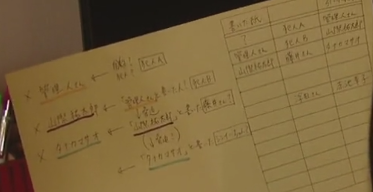 各演員真的演力不錯,連眼神跟手都有奇妙氣息。看得挺可怕。 原來現在主婦的日常EDC還要帶鐵鍊鉗子,下手也分毫不思,太強了。 官方Twitter情報細節還真多。 在新少年角照片的背後右下正是黑島的鞋盒,有2雙鞋不同黑島底色Label,而且有23號鞋。 配合前篇下列的紙條順序,發現變成以下的次序。 <順序B | 美里Route?> 黑島-收:赤池美里(字特細小) | 寫:?->事件:目黑的火事新聞?(與山際新聞同時播放) 浮田-收:赤池吾郎 | 寫: 赤池美里 -> 事件:美里家 美里-收:児嶋佳世 | 寫: 赤池吾郎 北川-收:白紙 | 寫: 児嶋佳世 -> 事件:GOLF郵遞 (20歲?) <白紙結束> 浮田-23號鞋(?)黑島下手。可能因知道太多。 除非黑島的紙是被榎本家收走並執行,不然順序B的事件應該是由黑島或浮田帶出跟結尾的。 連帶至児嶋的部份也是,因為收紙的美里已不在了。 翔太給的推理,説美里事件的人有可能外面到來,而且重度抽煙。煙口並沒有唇印而且很新,可能只是美里家的鄰居501男在垃圾房抽煙被木下唸,而過後直接由家中跑出去抽煙。 但新管理人説的事,讓他有一定的動機。 這推理順序是真的話,那一開始紙條遊戲起了2個起頭(山際Route /?美里Route),可能是意外。 但看者可能以為實現了,就自動下了手。 並沒有單順序。 第9話新HINT: